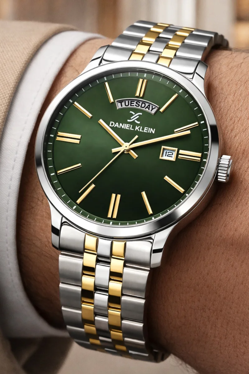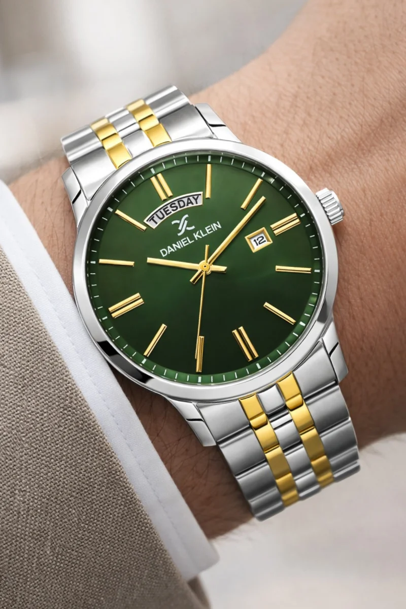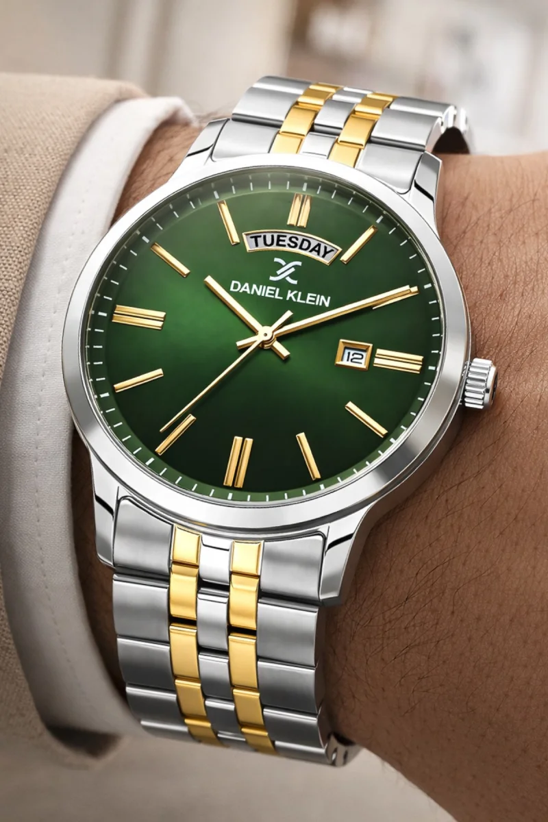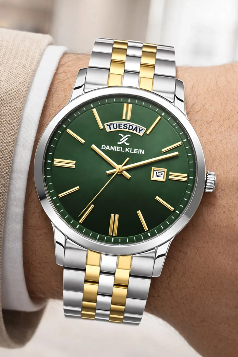Daniel Klein Çelik Kordon&Kasa Takvimli Erkek Kol Saati Bileklik Hediyeli Gümüş-Gold-Yeşil zmdk1205