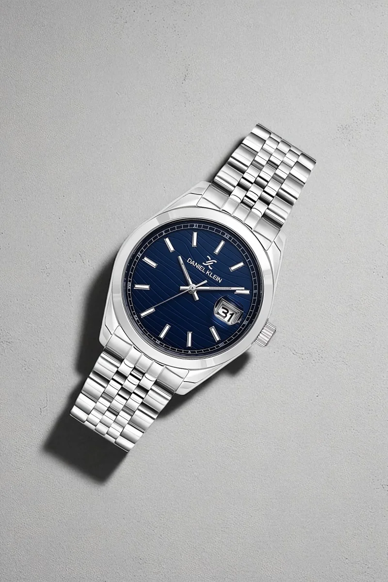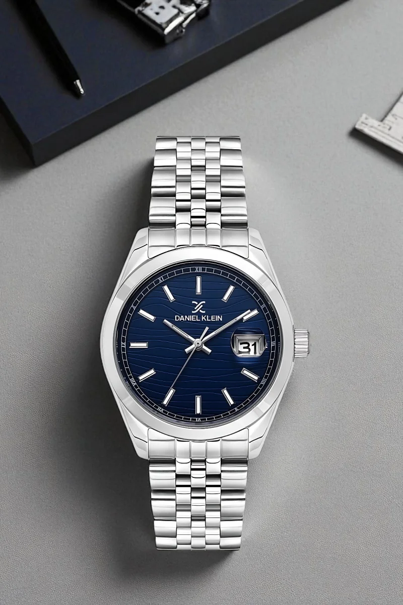 Görselde öne çıkan dalga desenli lacivert kadran, saate derinlik ve karakter kazandırırken, minimalist indeksler ve net akrep-yelkovan yapısı kolay okunabilirlik sunar. Sağ tarafta yer alan tarih göstergesi, iş ve günlük yaşamda pratik kullanım sağlar.