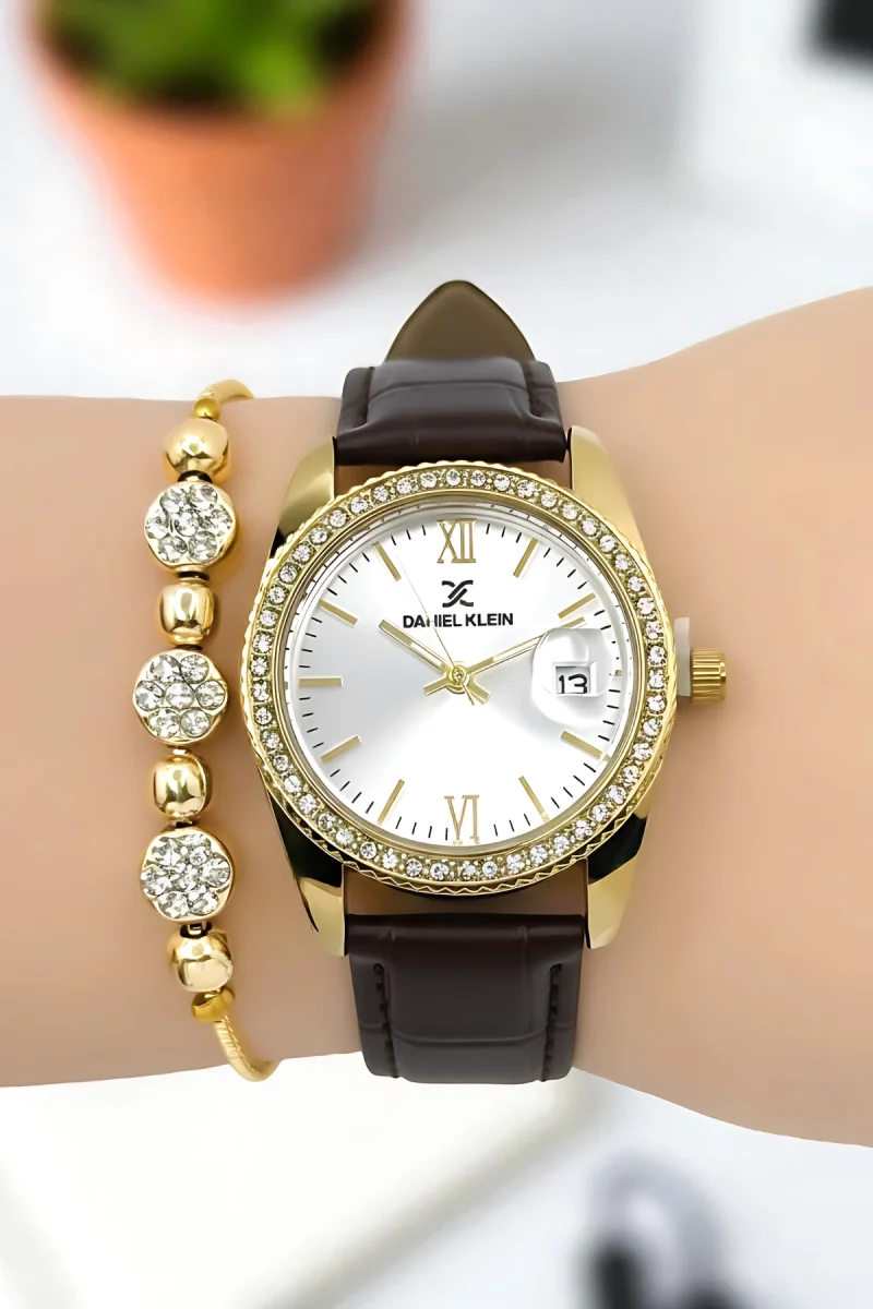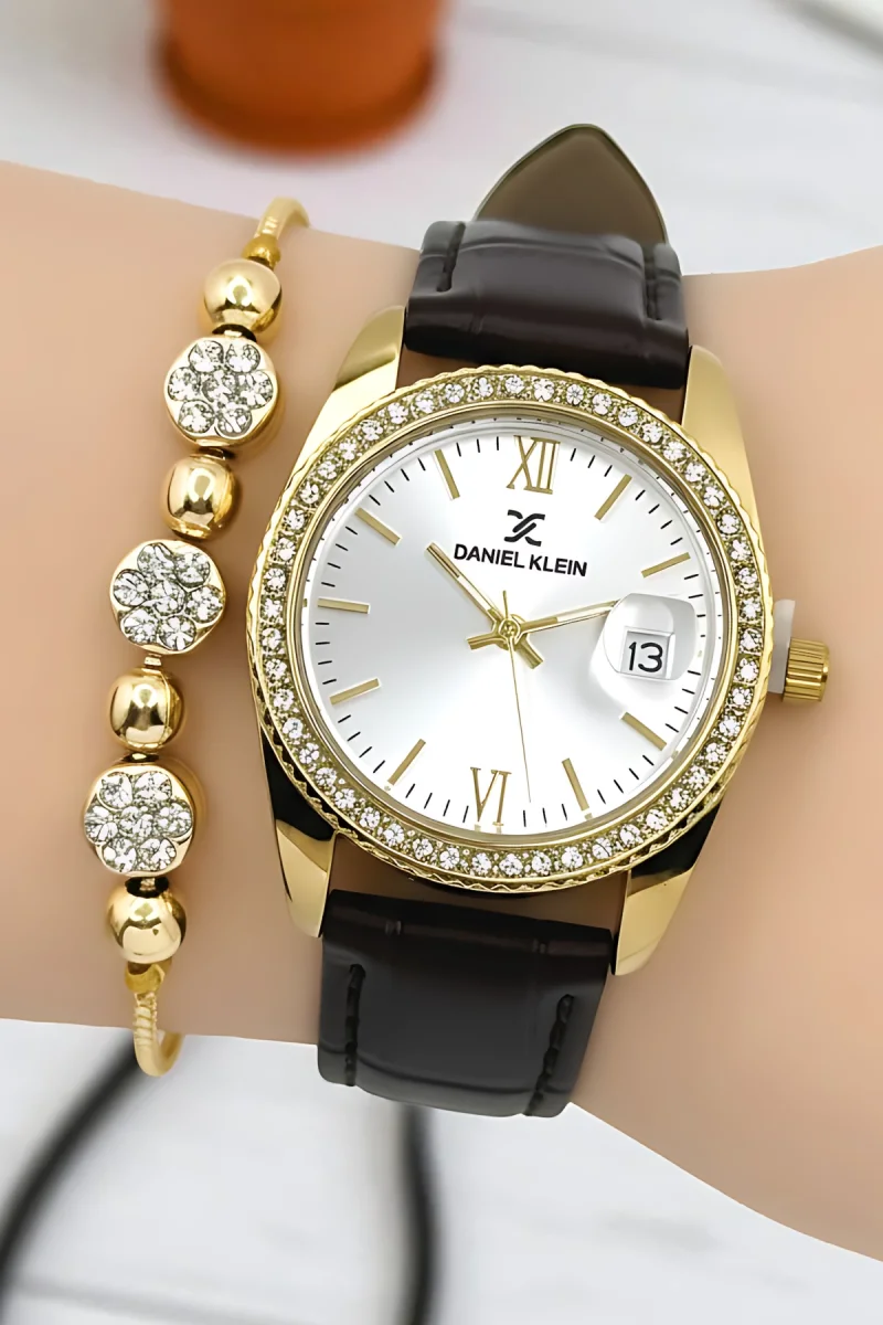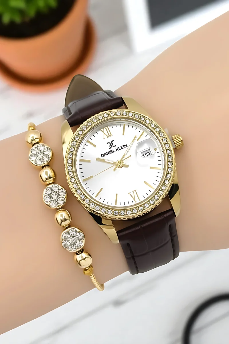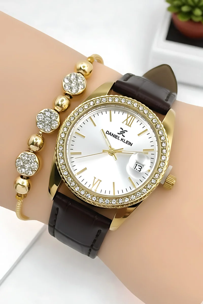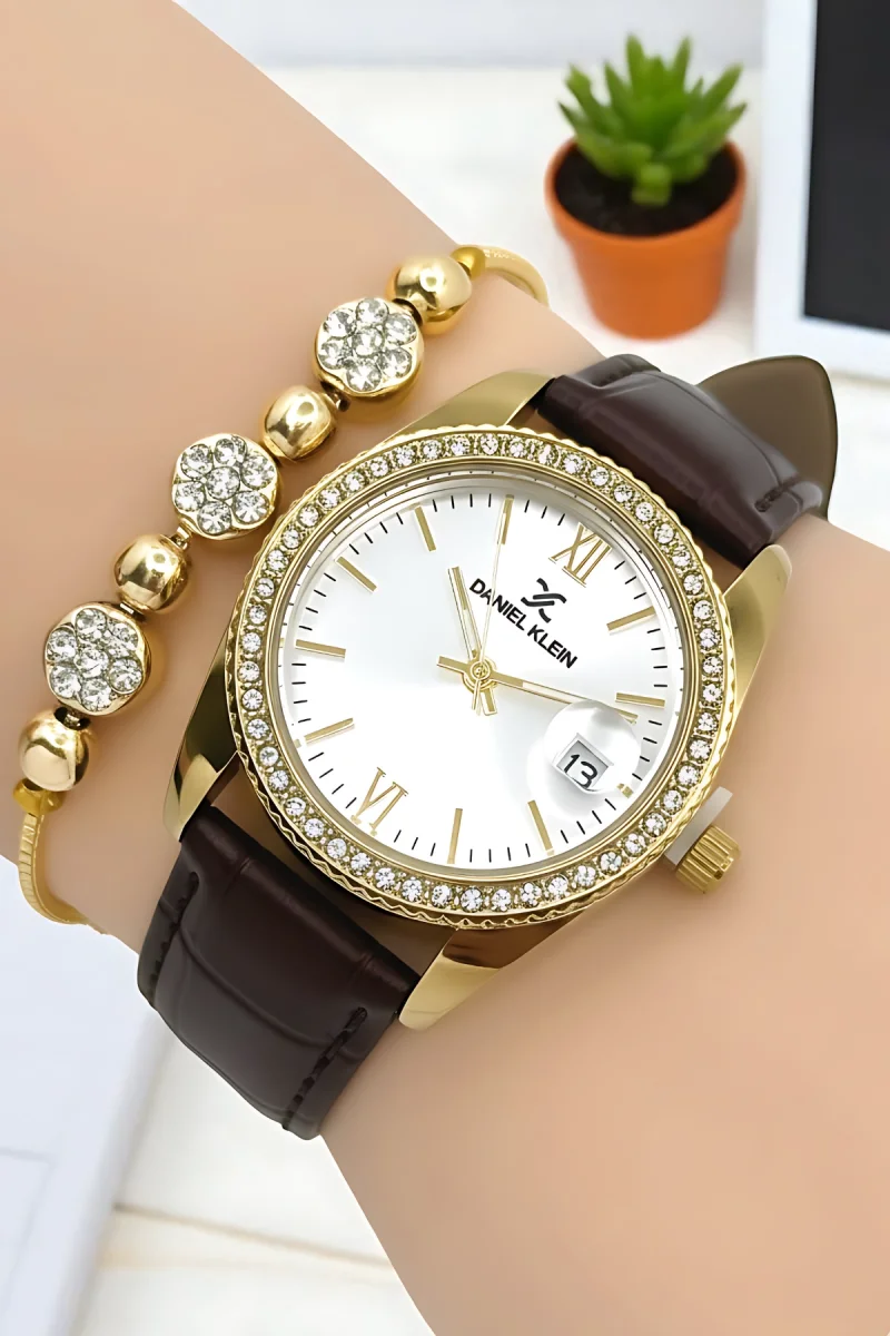 Daniel Klein Kadın Kol Saati, Deri Kordon, Çelik Kasa+Bileklik Hediyeli Kahve-Gold zmdk1198