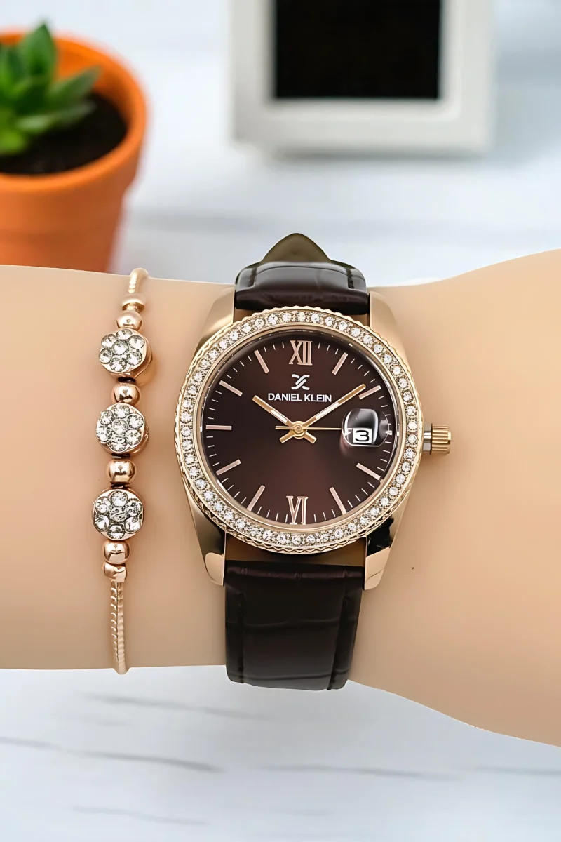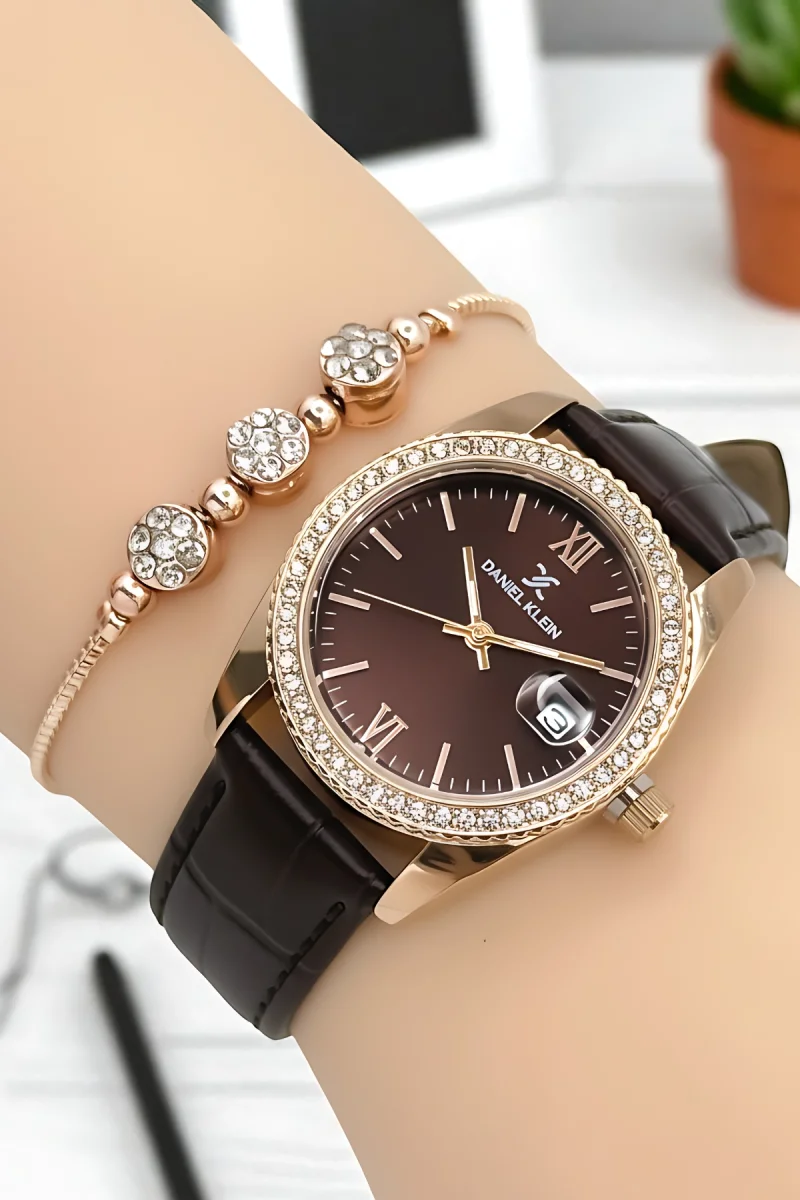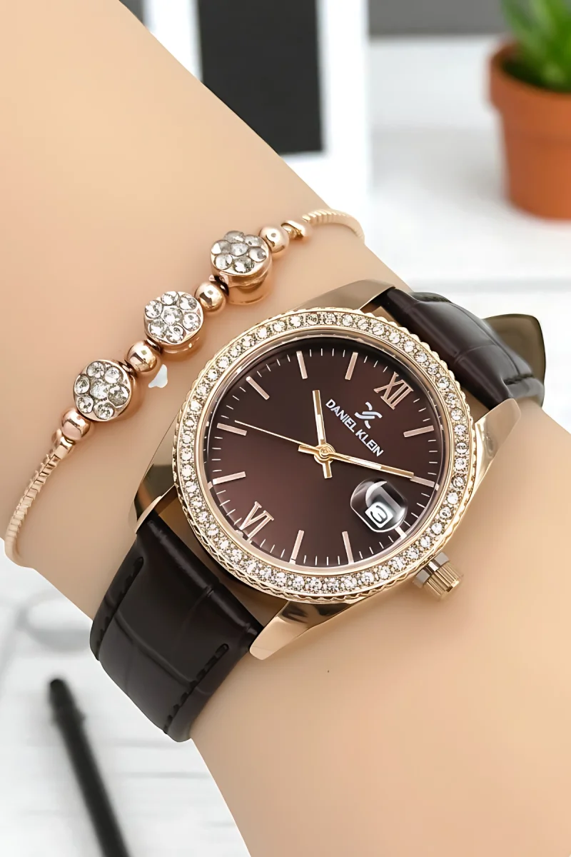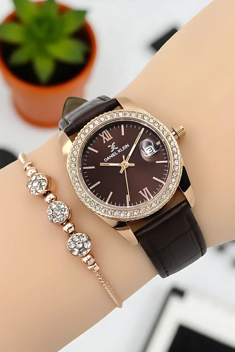 Daniel Klein Kadın Kol Saati, Deri Kordon, Çelik Kasa+Bileklik Hediyeli Kahve-Rose zmdk1198