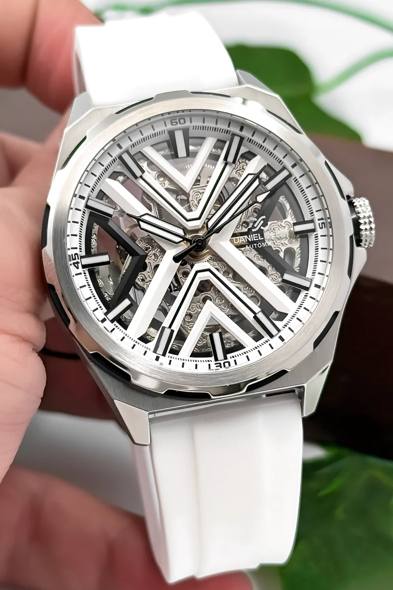 44 mm kasa çapı ve 20 mm kordon genişliğiyle bilekte güçlü bir duruş sergileyen bu özel model, paslanmaz çelik kasa ve silikon kordonun birleşimiyle üretilmiştir. Beyaz silikon kordon, hafifliği ve rahatlığıyla günlük kullanımı kolaylaştırırken, sportif ve modern bir görünüm kazandırır. Çelik kasanın parlak yüzeyi ise saate lüks bir dokunuş ekler.