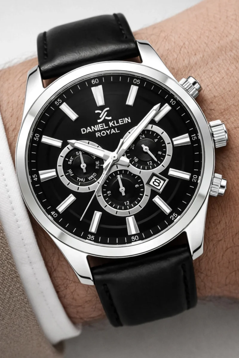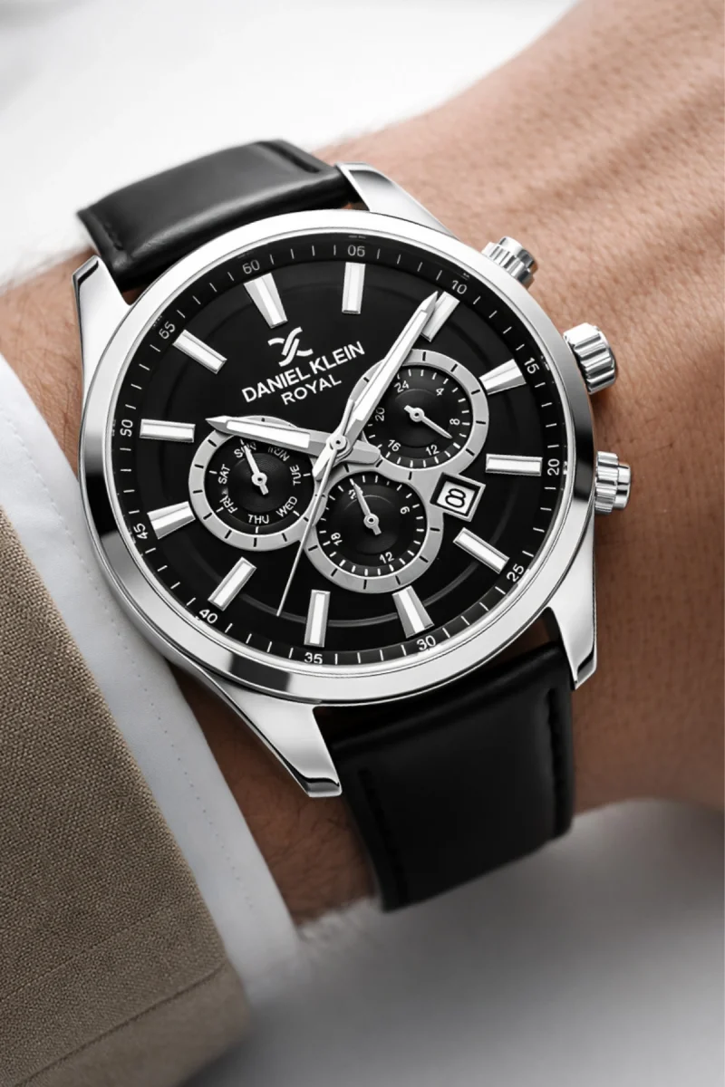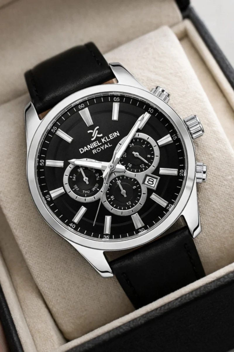 • Saatin 43 mm kasa çapı, erkek bileğinde net ve karizmatik bir duruş sergiler. Ne fazla büyük ne de küçük olan bu ölçü, modern erkek saatleri için ideal kabul edilen segmentte yer alır. Parlak metal kasa, ışığı dengeli biçimde yansıtarak saate premium bir görünüm kazandırır. Kasanın pürüzsüz yüzeyi ve net hatları, Daniel Klein’in Royal serisine özgü kaliteli işçiliği açıkça hissettirir.