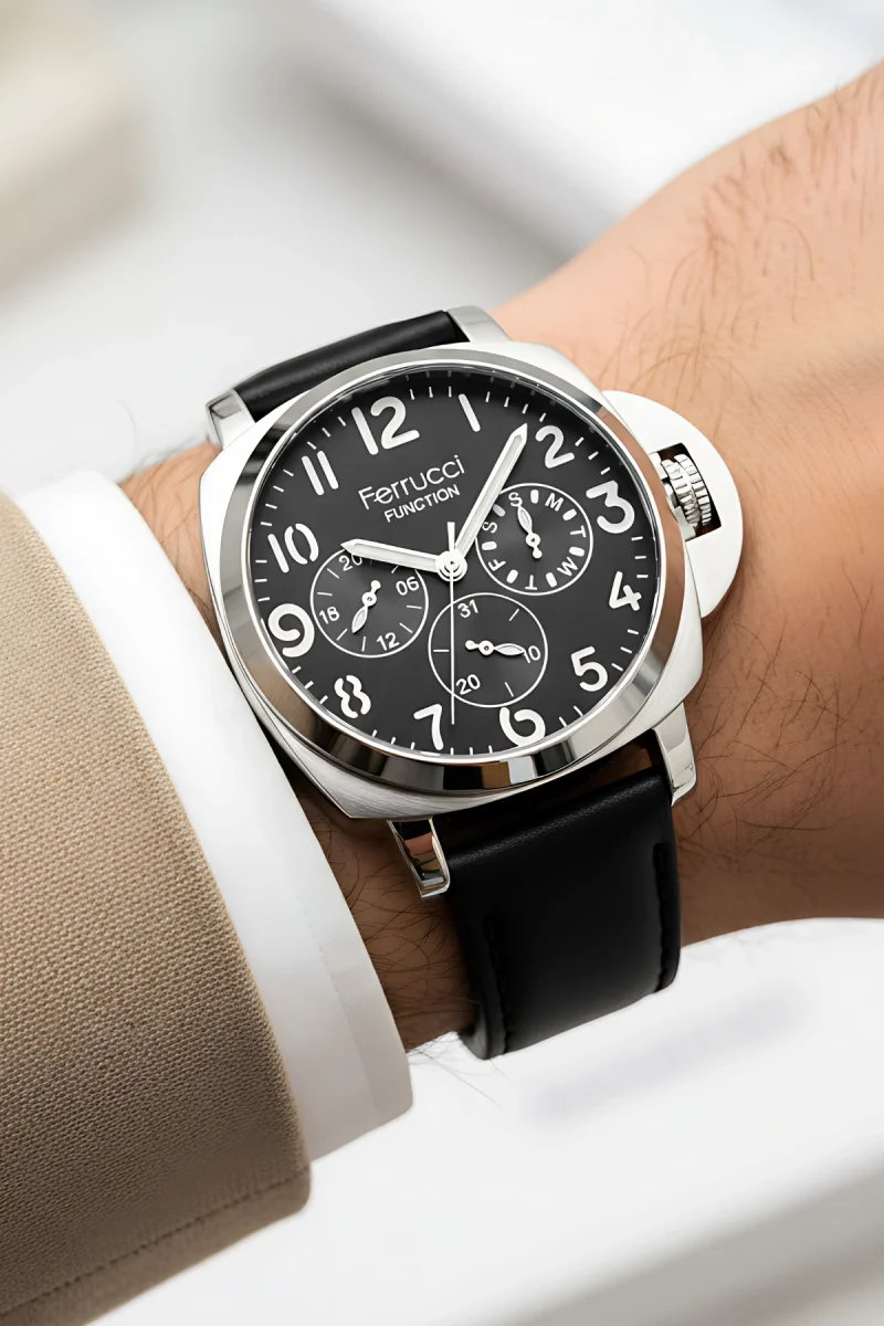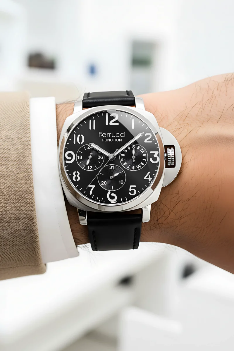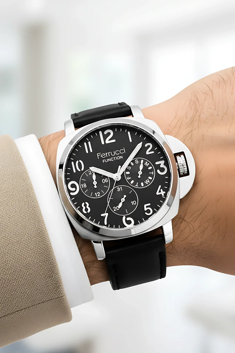 Ferrucci Marka Fonksiyonlar ve Takvim Aktif Siyah Renk Deri Kordonlu Erkek Kol Saati, şıklığı ve kalitesiyle tarzınızı yansıtmanızı sağlar. Hem günlük kullanımda hem de özel günlerde stilinizi tamamlayan bir aksesuardır. Bu saat, kendiniz için mükemmel bir seçenek olmanın yanı sıra hediye olarak da düşünebileceğiniz harika bir seçenektir.