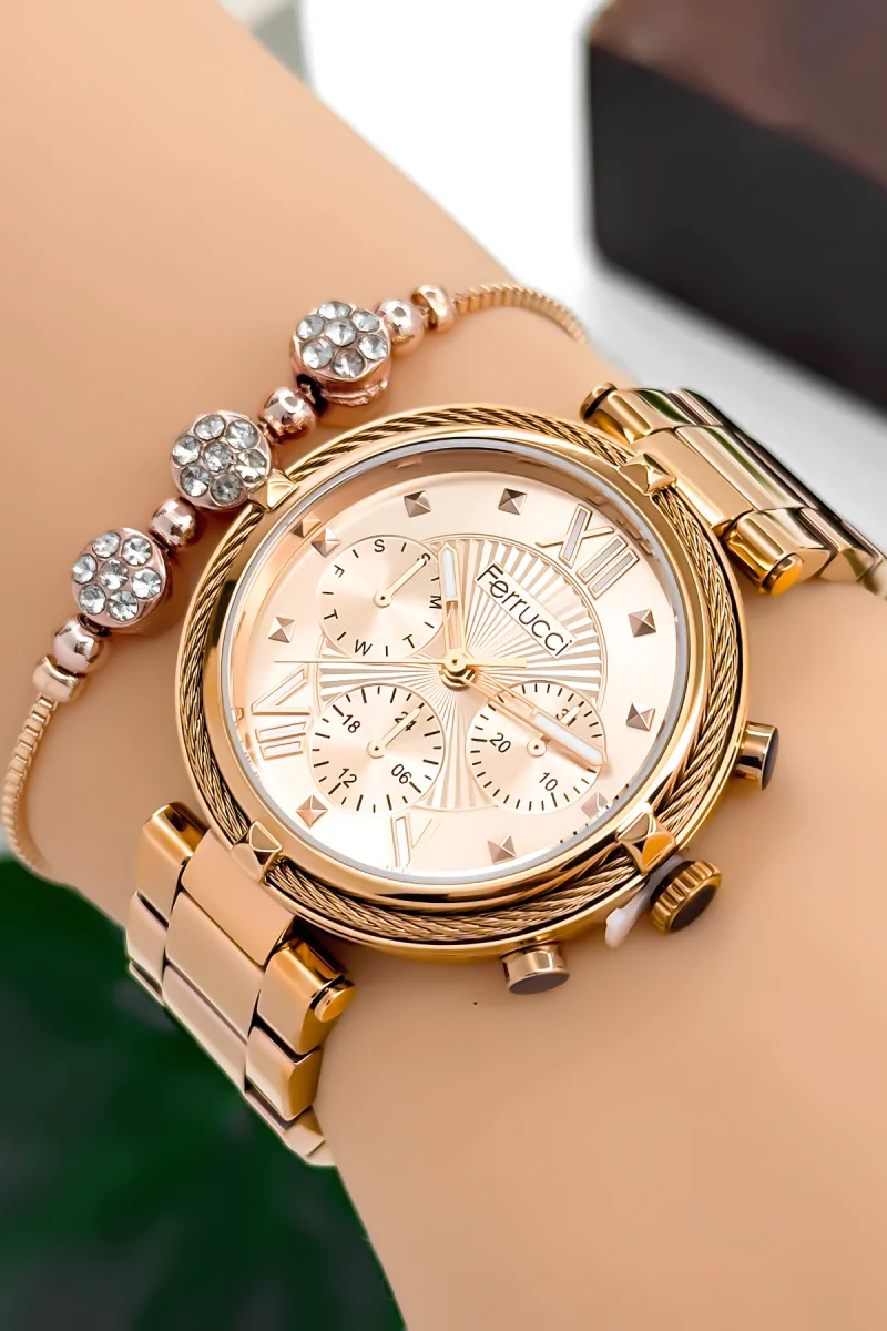"Ferrucci Kadın Kol Saati, şıklık ve zarafetin mükemmel bir kombinasyonunu sunan bir zaman ölçerdir. Çelik kordon ve çelik kasa ile tasarlanmış olan bu saat, taşlı bileklik hediyesiyle tamamlayıcı bir aksesuar sunar. Kasa çapı 38 mm olan bu saat, orta boyutuyla bileğinizde mükemmel bir uyum sağlar.