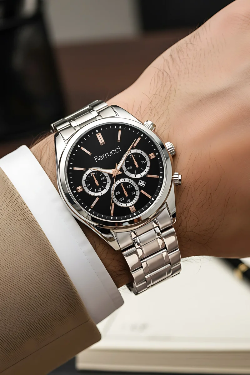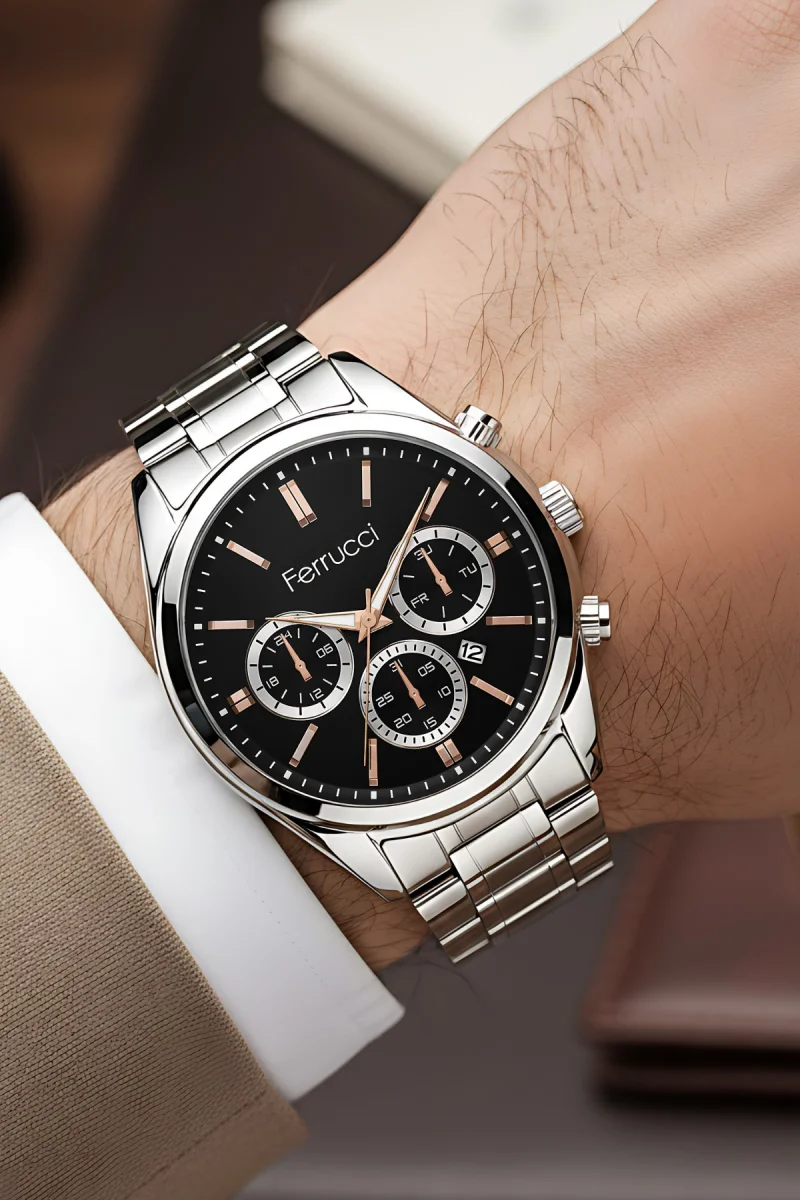 Ferrucci Takvimli Erkek Kol Saati Çelik Kasa & Çelik Kordon Gümüş-Siyah Renk zmfer214