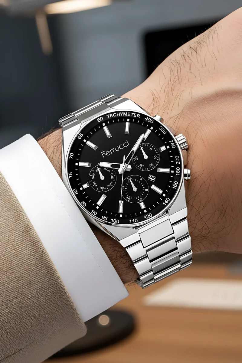 Ferrucci Takvimli Erkek Kol Saati Çelik Kasa & Çelik Kordon Gümüş-Siyah Renk zmfer215