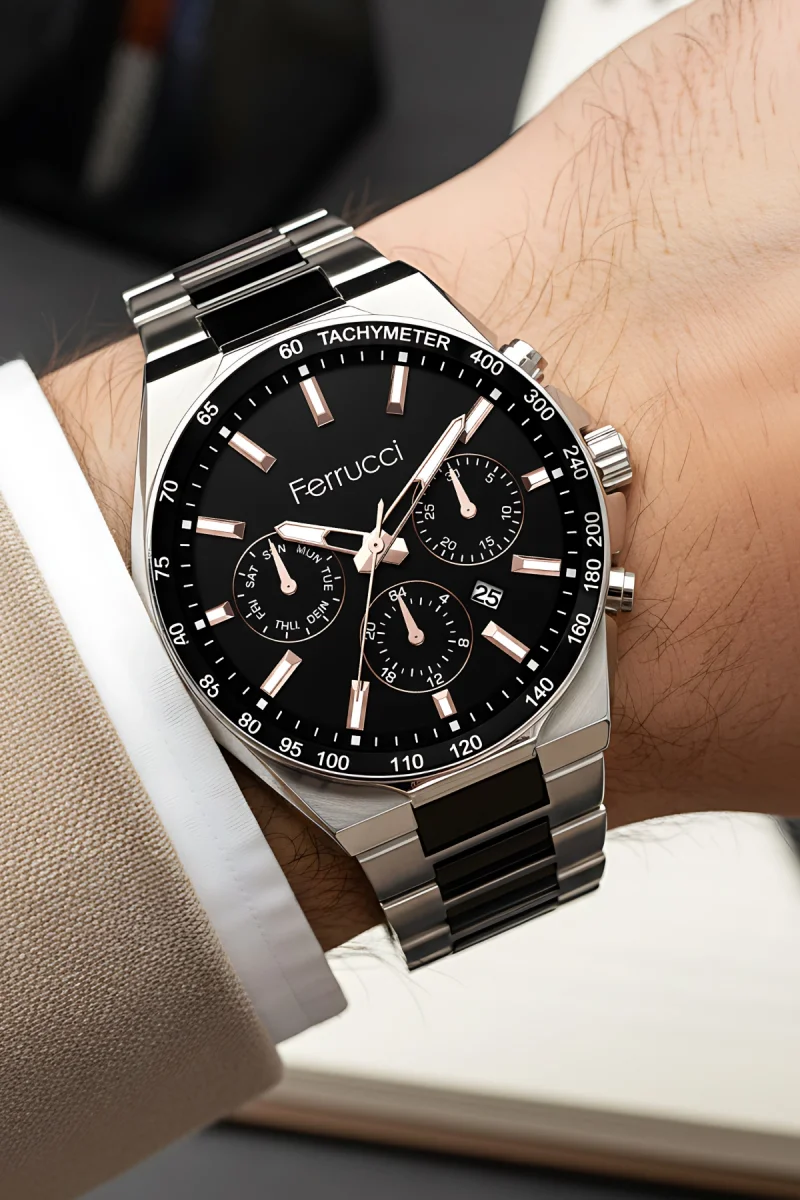 Ferrucci Takvimli Erkek Kol Saati Çelik Kasa & Çelik Kordon -Gümüş-Siyah zmfer215